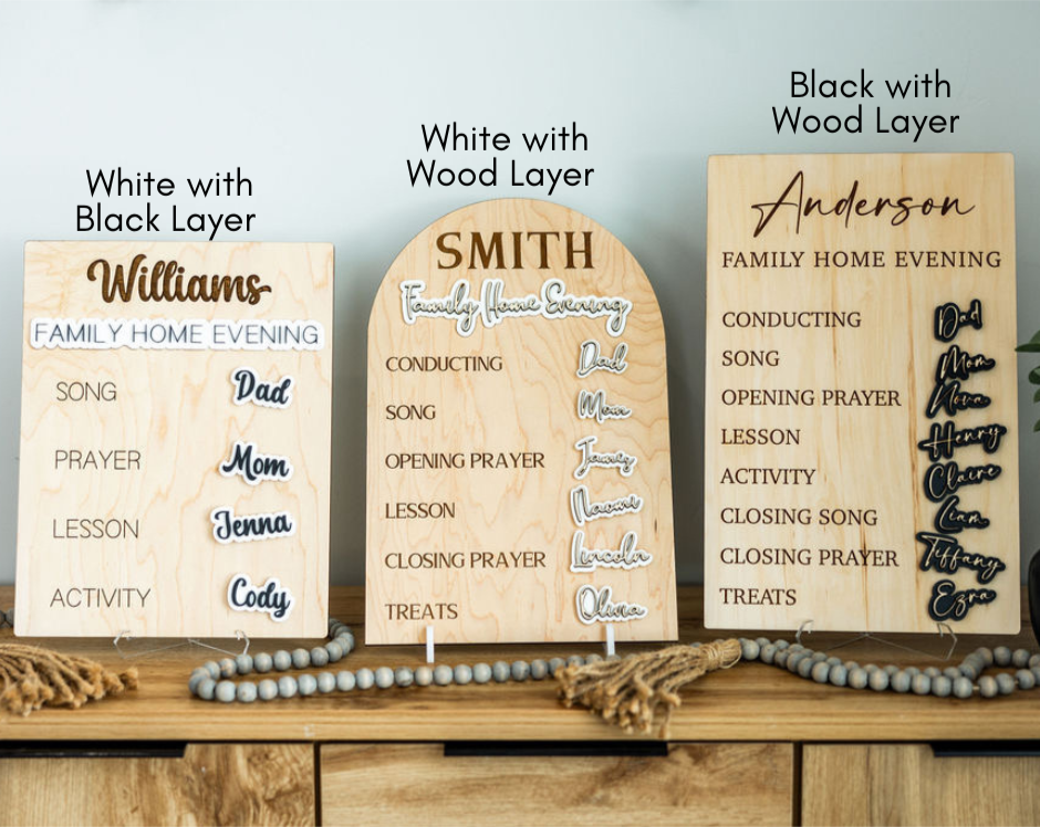 Bring your vision to life with a fully customized Family Home Evening (FHE) board. Instead of choosing from pre-designed editions, this option gives you complete control over the look and feel of your board — from fonts and colors to sizing, engraving, and layout.